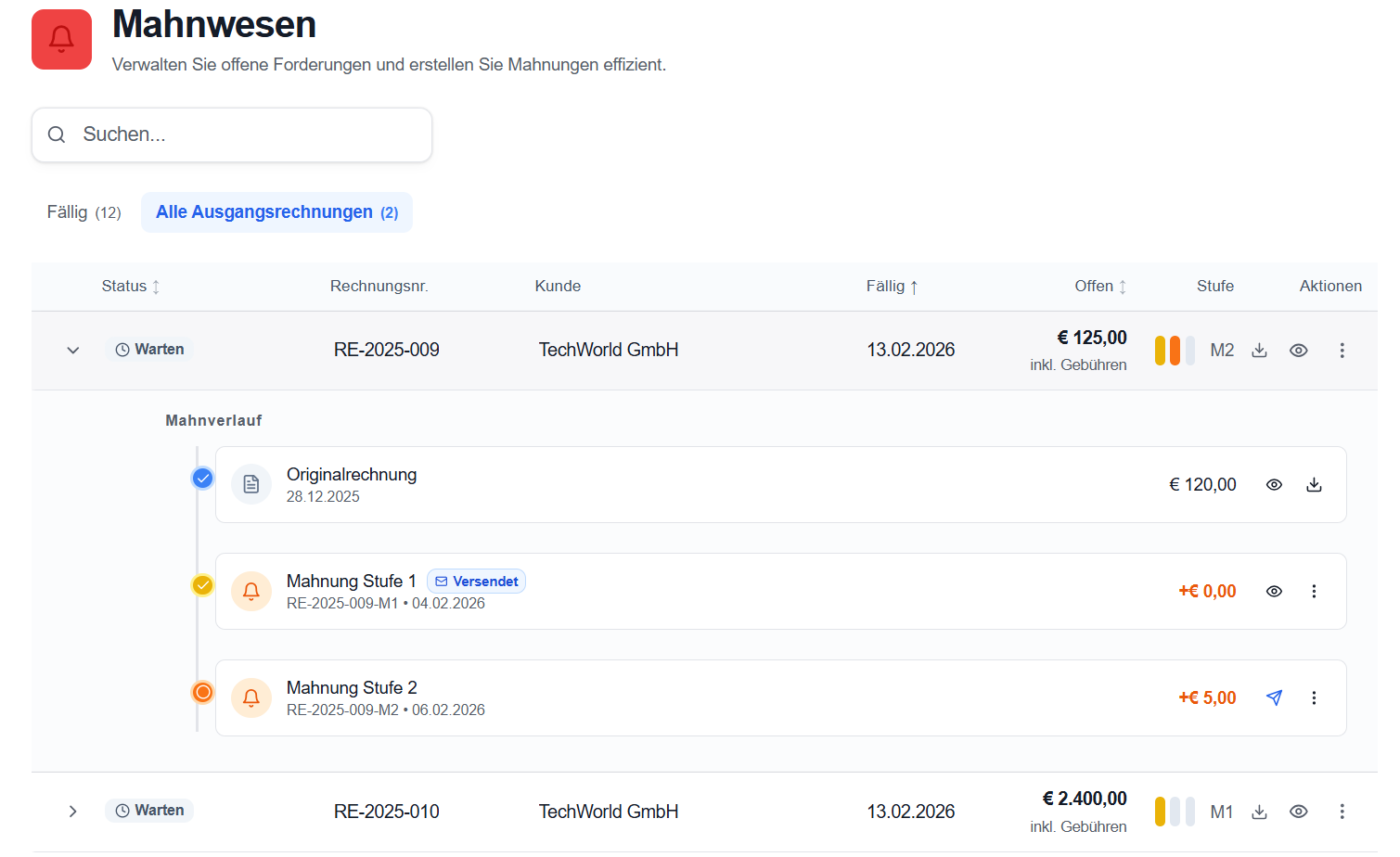 Du wirst per E-Mail benachrichtigt, sobald eine Rechnung überfällig ist — nicht dein Kunde. Du behältst die volle Kontrolle und entscheidest selbst, wann und wie du mahnst.